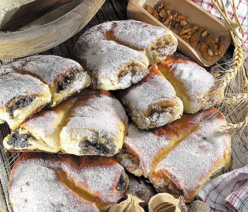 4. A tésztát meglisztezett gyúrólapon kisujjnyi vastagságúra nyújtjuk, majd 16 négyzet alakú lapra vágjuk. Ezek felénk eső oldalára kisujjnyi csíkban tölteléket halmozunk – nyolcra mákot, nyolcra diót. Egyenként felhengergetjük – éppen csak összeér a két tészta a töltelék körül, egy kicsit hosszúkásra sodorjuk, majd kifli formájúra hajlítjuk és kivajazott tepsibe egymás mellé rakjuk. Nem baj, ha sűrűbben vannak egymás mellett, mert így csak fölfelé nőhetnek, nem terülnek el. Olvasztott vajjal vagy olajjal körben mindet lekenjük, ott is, ahol majd összeérnek.