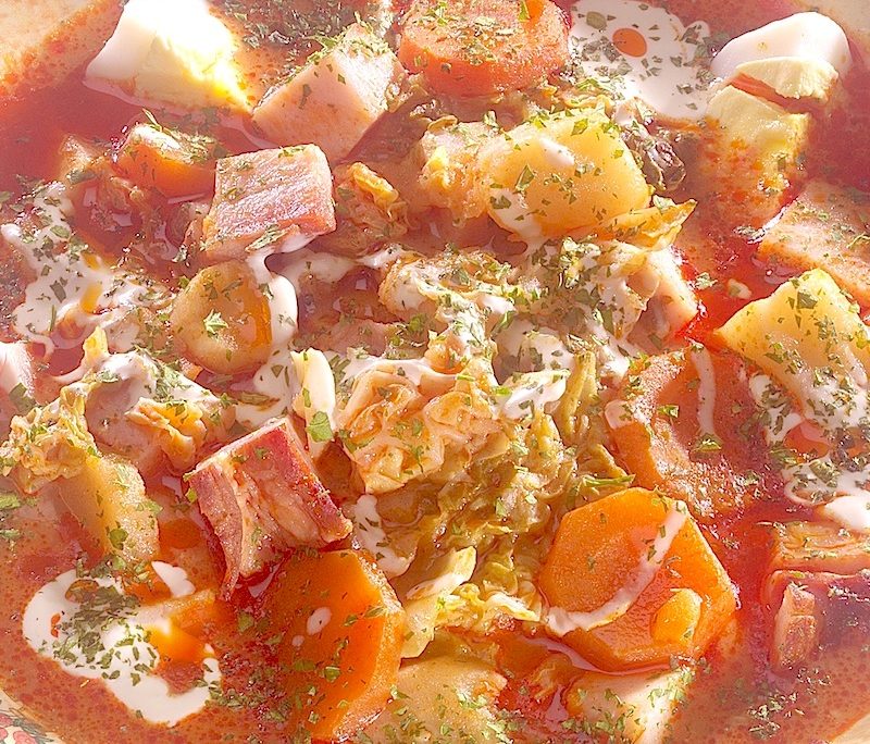 3. A megtisztított répát és gyökeret félcenti vastag karikákra, a kétféle kitorzsázott káposztát 3 centis kockákra vágjuk. Együtt a csülök főzőlevébe szórjuk, kb. 35 perc alatt puhára főzzük. Nagyjából félidőben belekeverjük a 2,5 centis kockákra aprított burgonyát is.