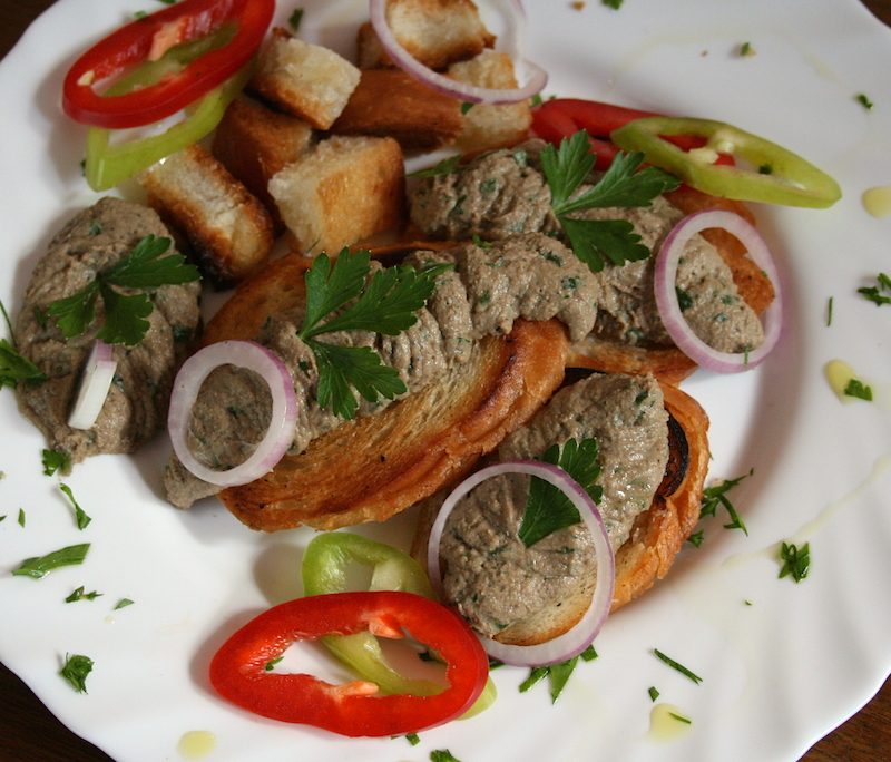 3. Ha a máj puha, a vajat beleolvasztjuk, a mustárral és a balzsamecettel ízesítjük. Amikor kihűlt, krémesre turmixoljuk,majd hozzákeverjük a finomra aprított petrezselymet.