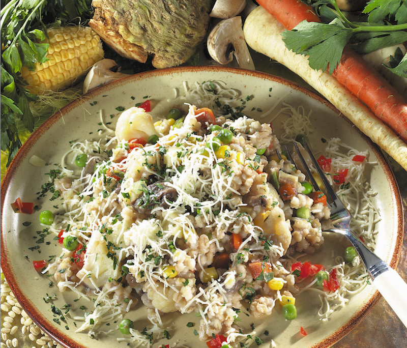 4. A puha árpagyöngyöt a zöldségekhez keverjük. Reszelt sajttal behintve tálaljuk.